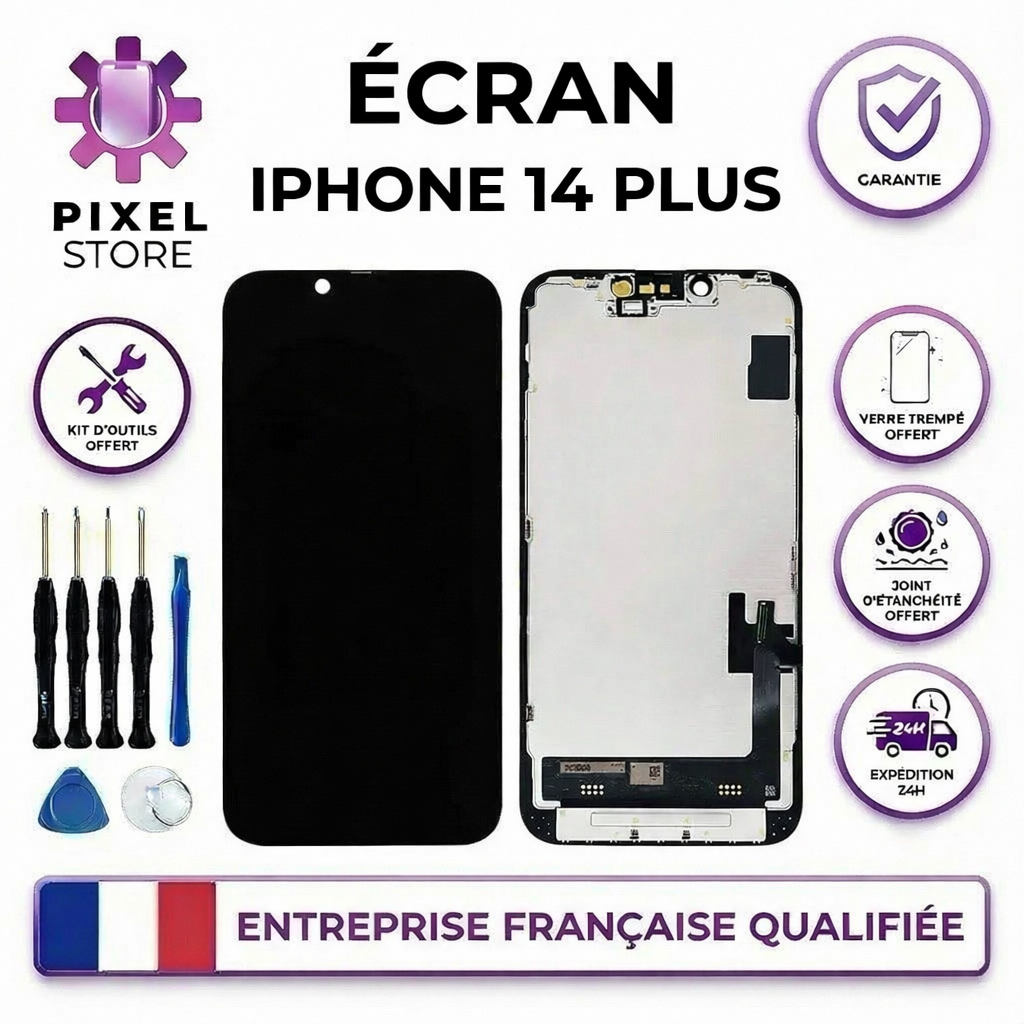 Écran de remplacement pour iPhone 14 Plus, sélectionné et testé en atelier professionnel PixelStore. Chaque écran est contrôlé un par un avant expédition afin de garantir un affichage et un tactile parfaitement fonctionnels.
